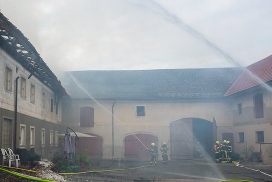 Im Dachbereich eines großen Vierkanthofes, auf dem sich auch eine Photovoltaikanlage befunden hatte, war Feuer ausgebrochen. Ein Teil des Daches war in Vollbrand und die große Rauchentwicklung war weithin sichtbar. Dank dem schnellen Eingreifen der Einsatzkräfte und zweier Brandschutzmauern konnte eine Ausbreitung der Flammen auf den gesamten Gebäudekomplex verhindert werden und der Brand gelöscht werden.