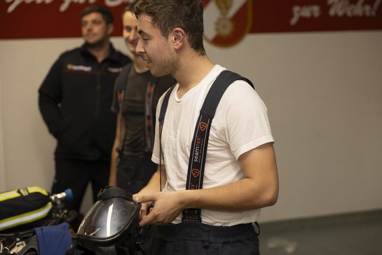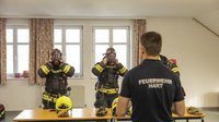 Innerhalb einer festgelegten Sollzeit müssen die Teilnehmer – vom Anlegen der Schutzjacke bis zum Anschließen des Atemschutzgerätes – vollständig einsatzbereit sein.