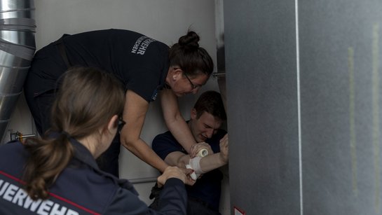 Neben Übungsaufgaben, die in jedem Erste Hilfe Lehrgang behandelt werden, wurden hier auch spezielle Herausforderungen beübt. Dazu gab es einen Raum im Feuerwehrhaus ohne Fenster, bei dem mehr oder weniger im Dunklen geübt werden musste. Als Übungsannahmen waren hier eine Schnittverletzung mit Motorsäge im Wald bei eintretender Dunkelheit, oder ein Stromschlag in einem Raum mit Wasserschaden, wo der Strom nicht eingeschaltet werden kann.