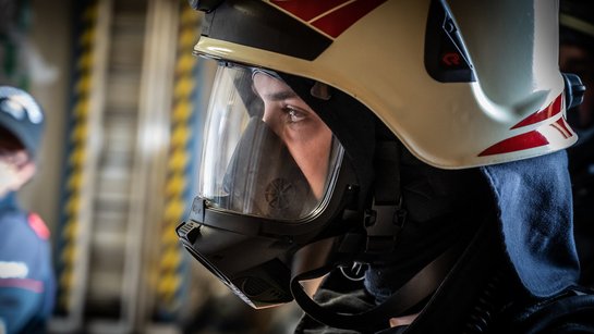 Schwerer Hitzeschutz oder gasdichter Schutzanzug ausschließlich in Verbindung mit schwerem Atemschutz.